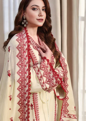Desert Rose is a winter-ready 3-piece linen outfit designed in a soft cream tone, enhanced with intricate red embroidery for a striking yet elegant contrast. The long kurta and straight trousers offer a comfortable, regular-fit silhouette suitable for colder seasons. Paired with a matching embroidered chiffon dupatta, this ensemble delivers warmth, refined detailing, and timeless winter style.
